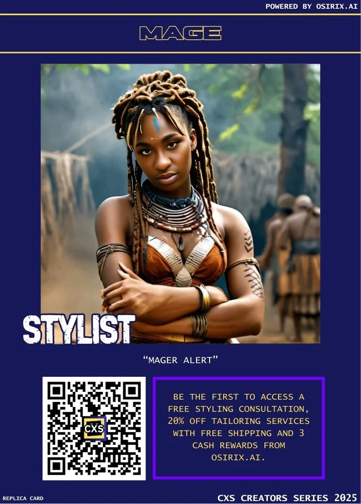 Young woman with dreadlocks and tribal jewelry, arms crossed, standing outdoors in a natural setting with blurred people and trees in the background.